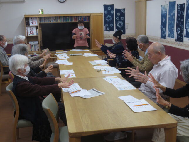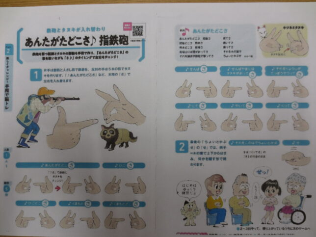 その後は、脳活性化のための「指の運動:あんたがたどこさ♪ 指鉄砲」エクササイズを行いました。鉄砲のチョキ・キツネの指形を、あんたがたどこさの歌に合わせて左右別々に行います。最初は慣れないと戸惑いますが、慣れてきてうまくいくととっても充実感が湧いてきて、脳の活性化には良いとのことです。