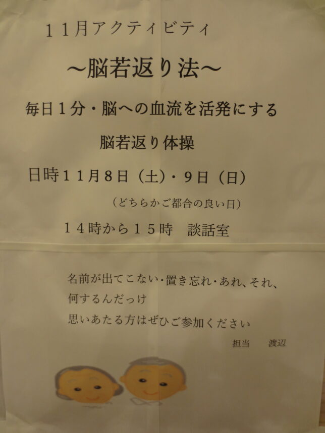 今月のアクティビティは、認知症や体の若返りを目指して必要な「脳の活性化・若返り体操」を、講師の渡辺コンシェルジュさんの基に開催されました。いつも通り参加者が多いため、土曜と日曜日に分けて2日間で行いました。