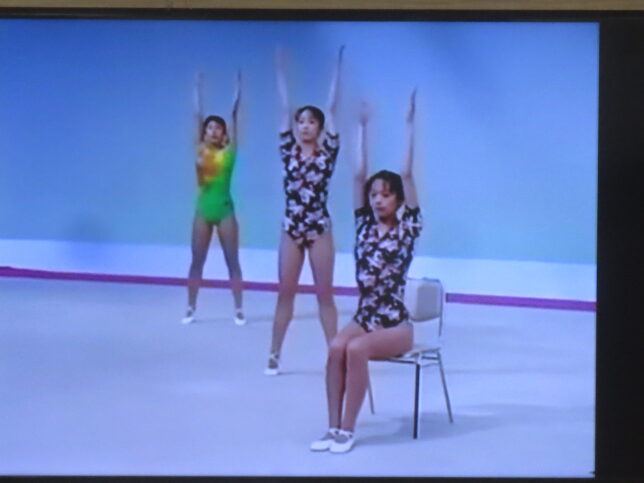 まずは、恒例の「ラジオ体操第1と第2」を、参加者皆さんで行いました。前方の大画面の体操ビデオを見ながら、皆さんしっかりと行ないました。