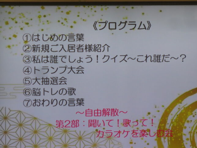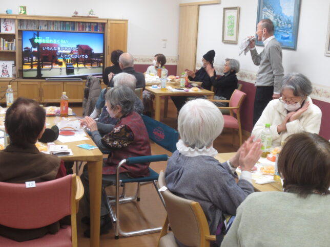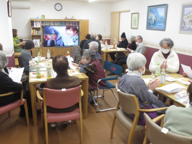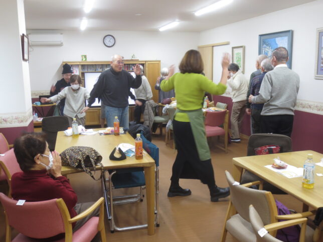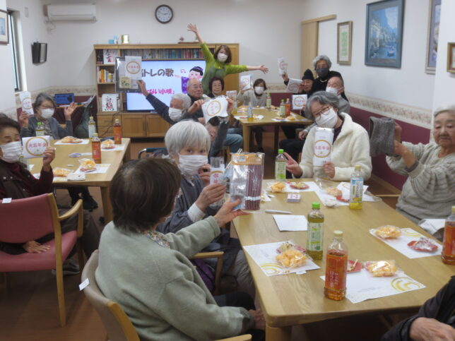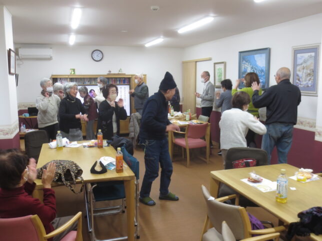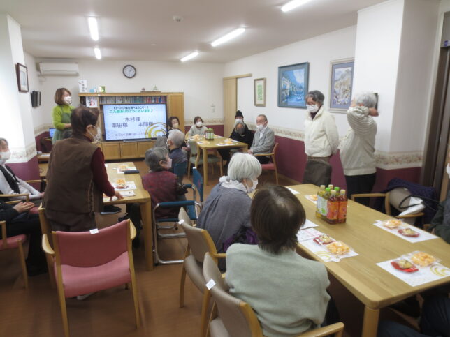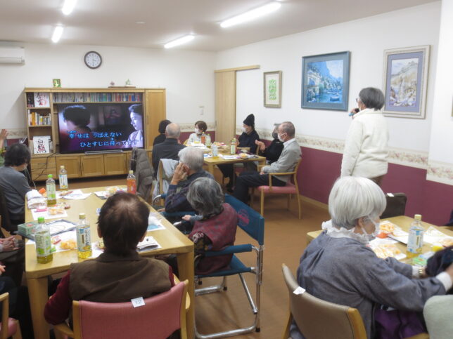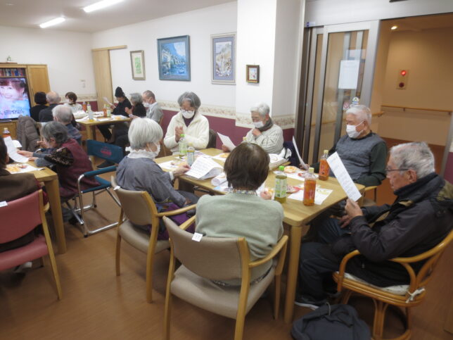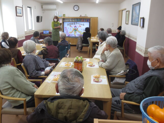 今月は年末ということで、コンシェルジュの松井さんの企画「大忘年会スペシャル」と題して、入居者の皆さんと忘年会を行いました。参加者の皆さんは大変楽しみにしていたようで、かなり早くから部屋の前に並んで待っている状態でした。