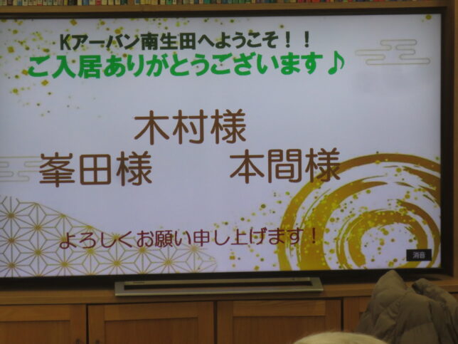 まずは、新規入居者様のご紹介です!この数か月の間に、新しく入居してこられた方が3名ほどいまして、こちらが峯田様、木村様、本間様です。