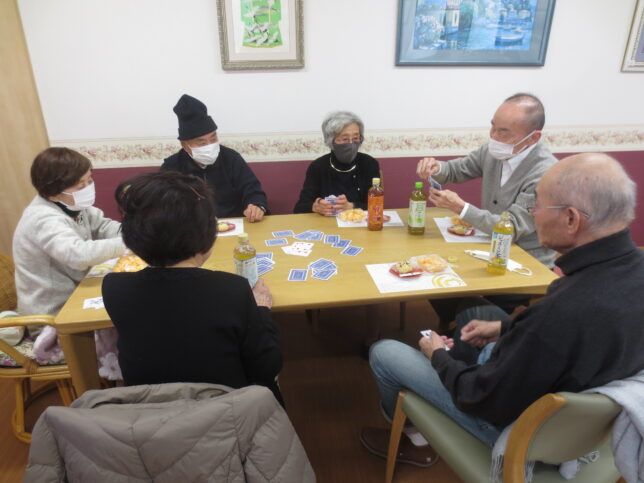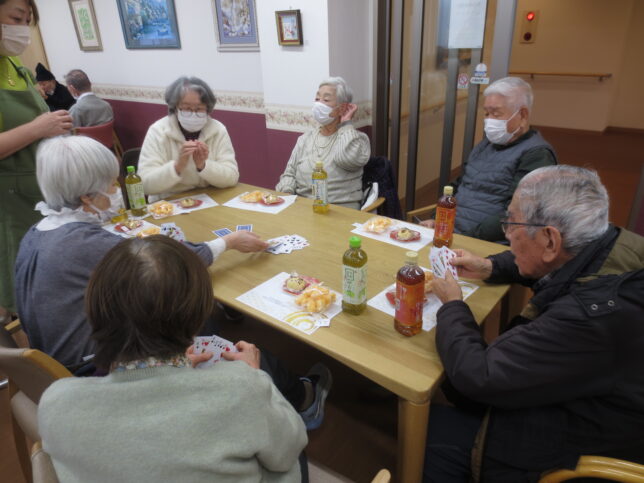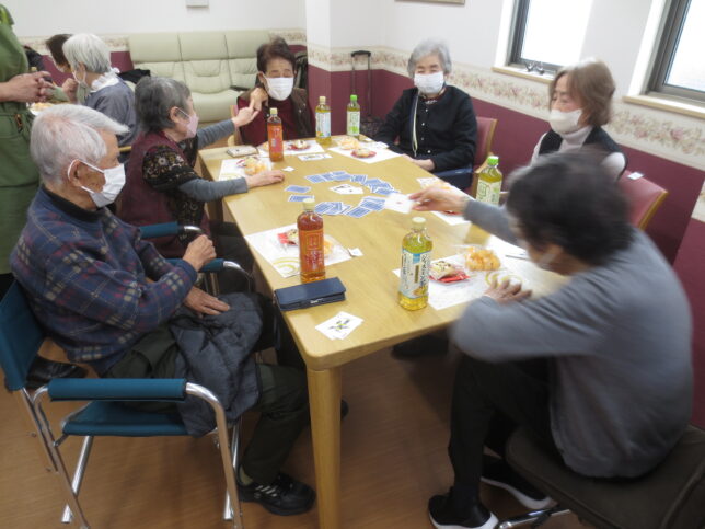 その後、各テーブルでの「トランプで遊ぶ!」と題して、ブタのしっぽゲームを行いました。各テーブル6人ずつで「裏返したカードから同じ種類のカードを出した方が出ているカードをすべて取る」というゲームで、最後になにも持ってない方が1番になります。また、取ったカードは自在に出せますので、皆さん頭を使って真剣にプレーしていました。その様子が、下記画像の通りです。