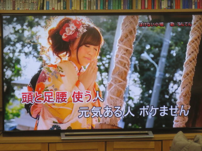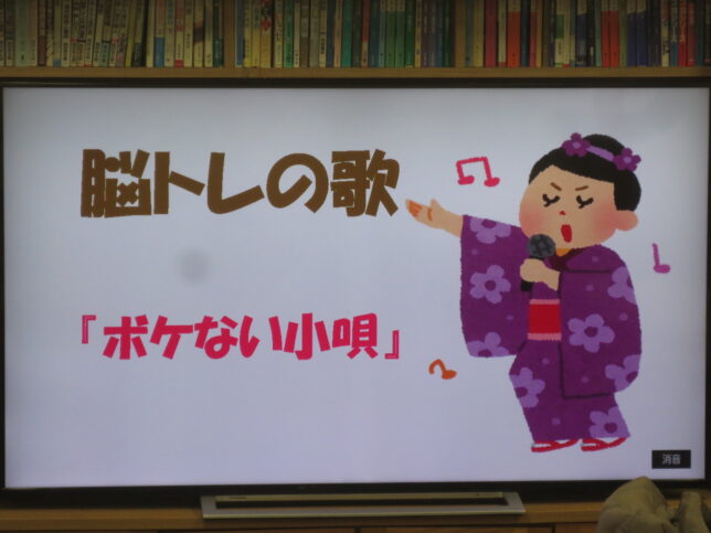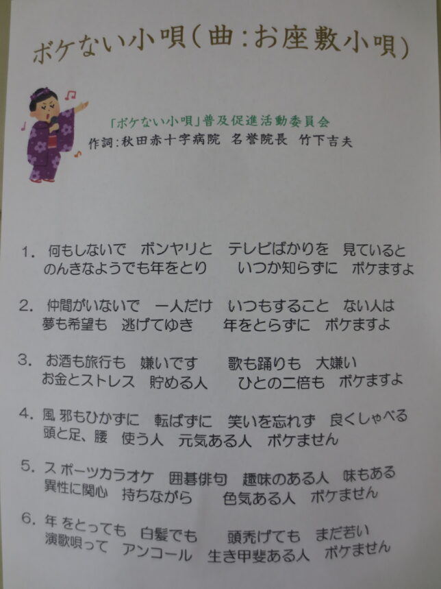 そして、プログラムはすすみ「脳トレの歌」の時間となりました。題名はなんと「ボケない小唄」です。作詞は、秋田赤十字病院名誉院長の竹下吉夫先生で、曲は「お座敷小唄」のメロディーです。