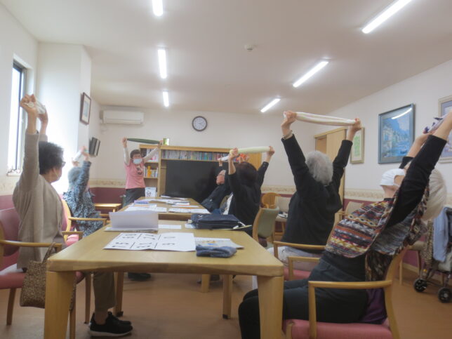 その後、転倒予防体操(歩く力、転ばない力を鍛える)ということで、まずは必要な握力を保つために「グーパー体操や手を握ってグッと開くこと、タオルを使って指先でタオルを握る運動、左右に絞る運動、背筋を伸ばす運動(正しい姿勢確保)」などをしっかり行いました。これは握力や正しい姿勢を保つことで、転倒予防や認知症予防にもなるということです。