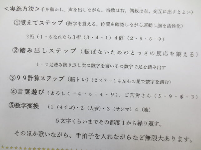 例えば、手を動かし・声を出しながら・足踏みをするとか、踏み出しステップ(転ばないためのとっさの反応を鍛える)として、床に敷かれた数字を足で順番にとらえる運動、言葉遊びとして渡辺講師が(よろしく=4・6・4・9)ご苦労さん(5・9・6・3)などといったら、足でその数を的確に踏む運動、その時に腕も前後に振ることで多重同時に行うトレーニングも行いました。